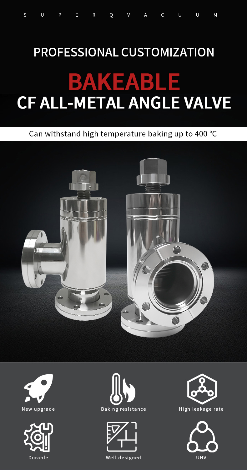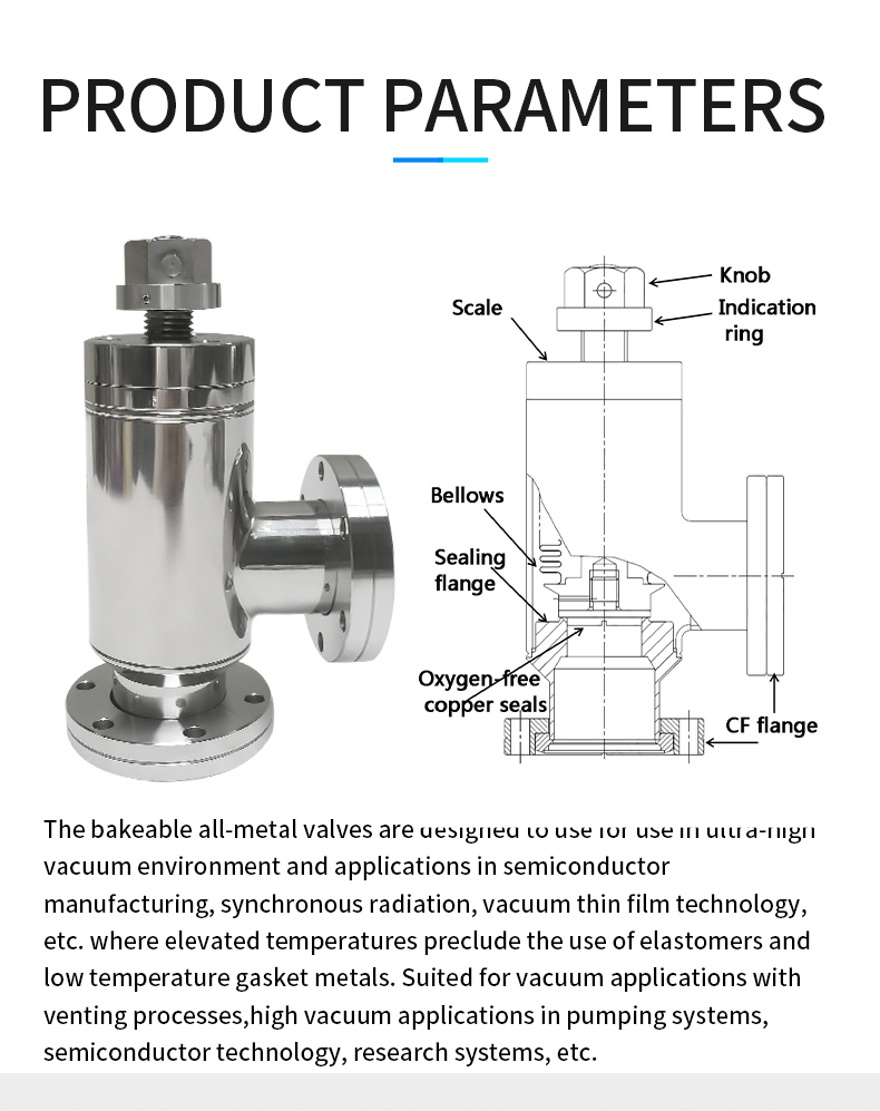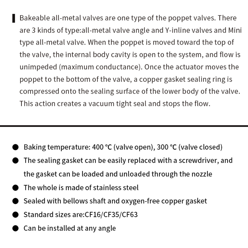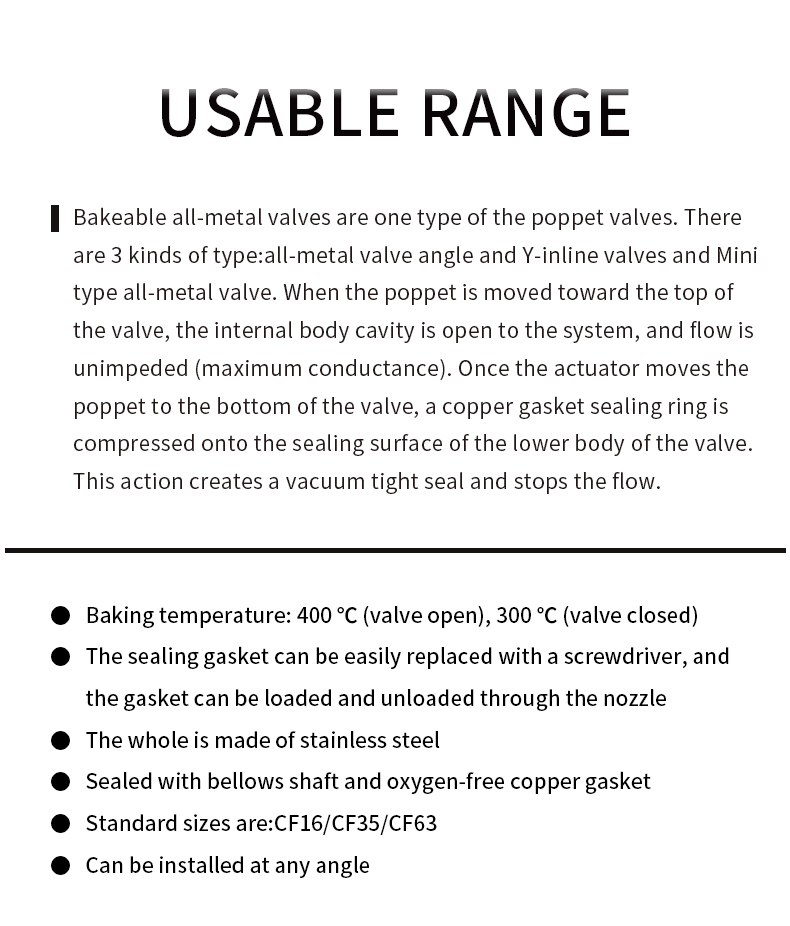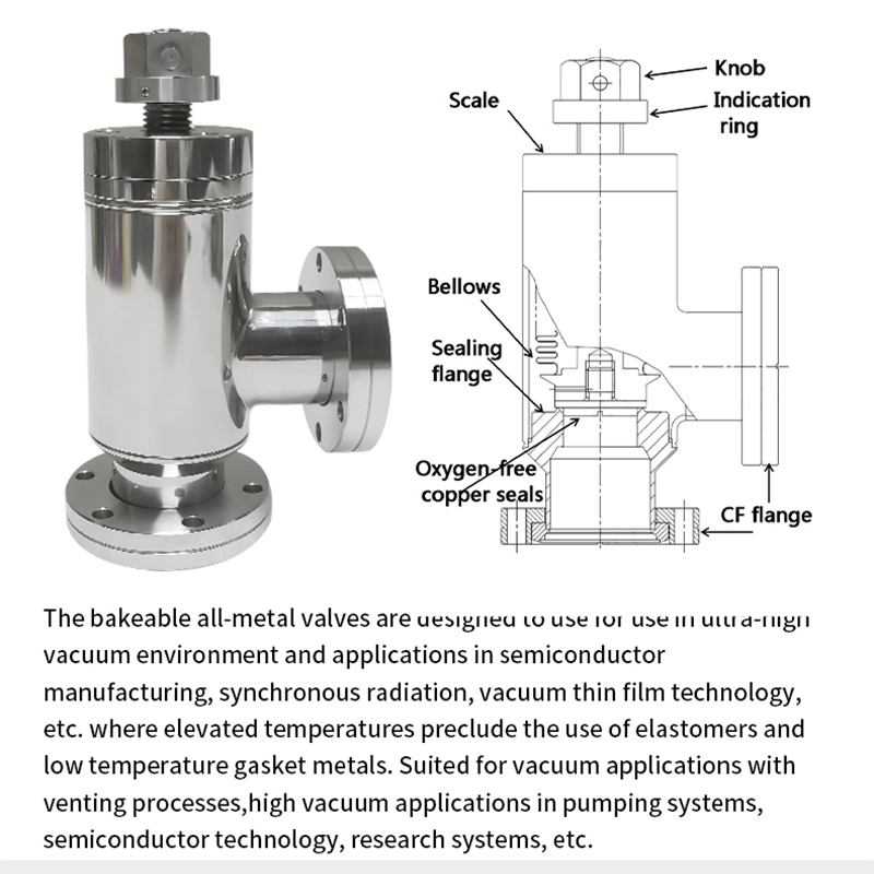 The bakeable all-metal valves are designed to use for use in ultra-high vacuum environment and applications in semiconductor manufacturing, synchronous radiation, vacuum thin film technology, etc. where elevated temperatures preclude the use of elastomers and low temperature gasket metals. Suited for vacuum applications with venting processes,high vacuum applications in pumping systems, semiconductor technology, research systems, etc.
