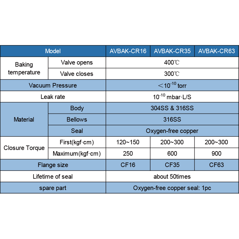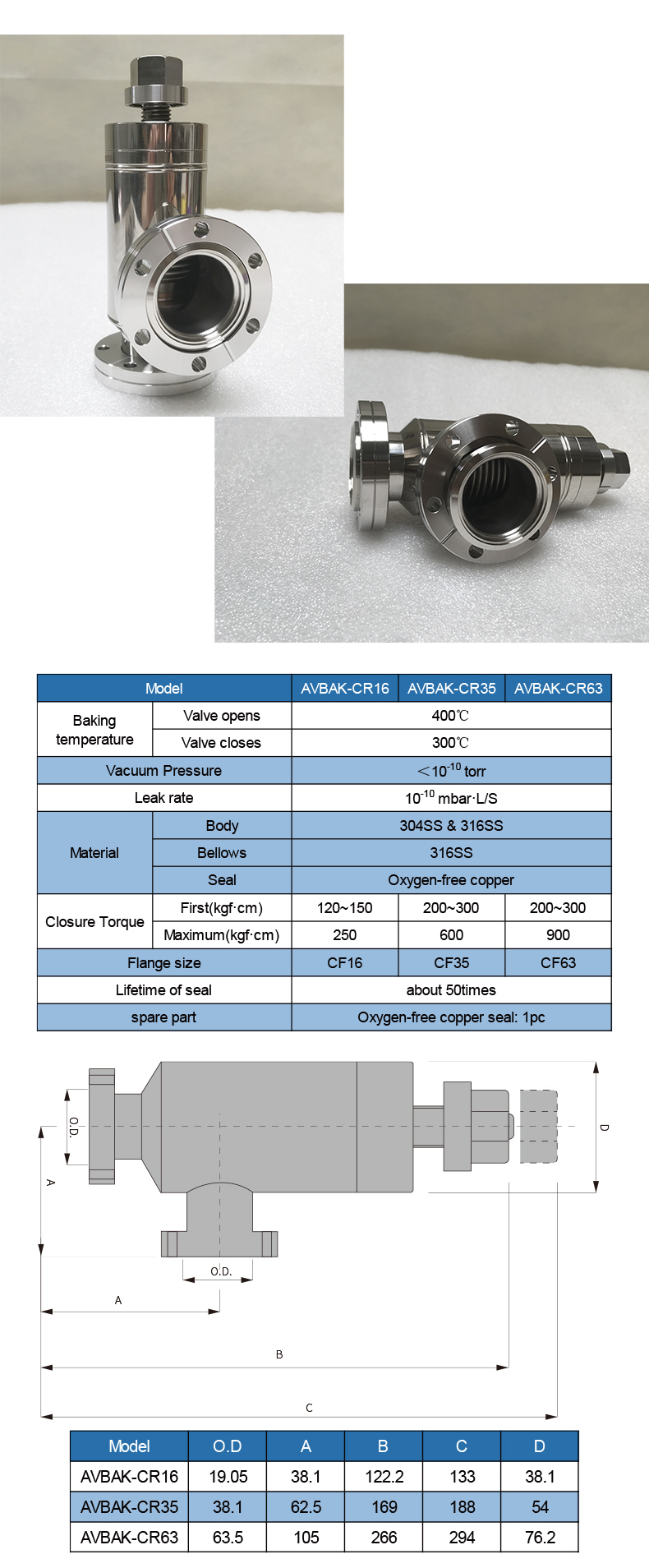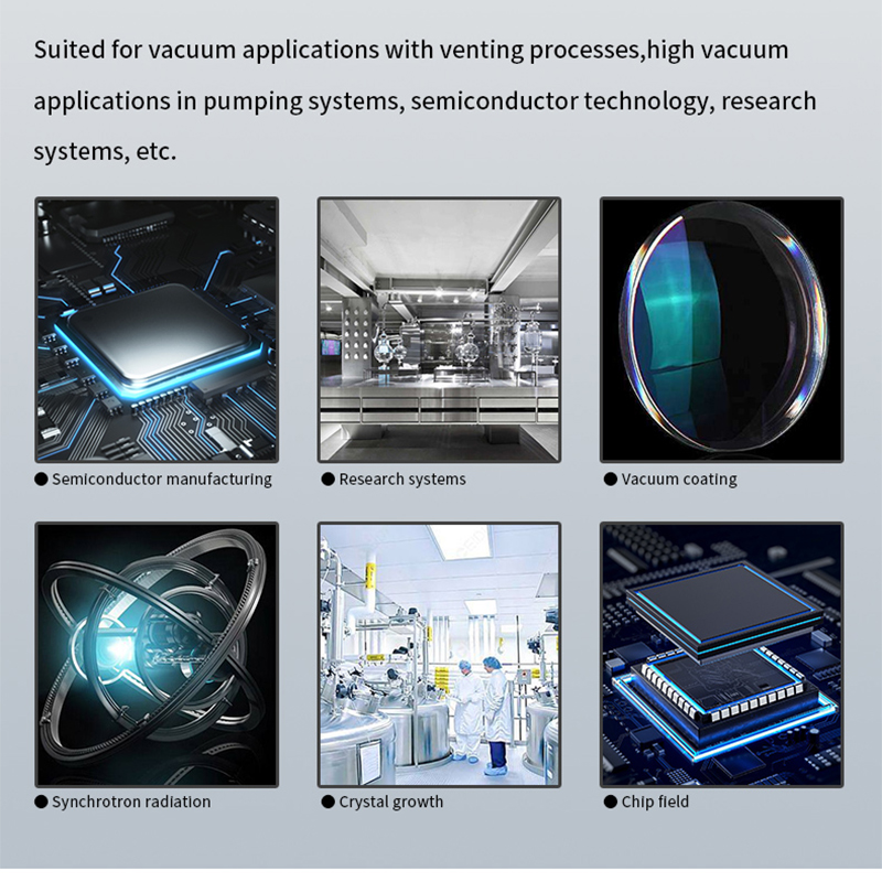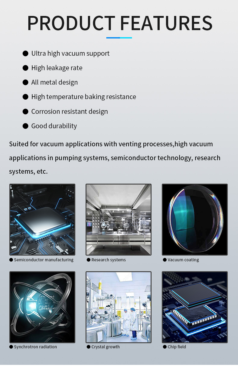 The bakeable all-metal valves are designed to use for use in ultra-high vacuum environment and applications in semiconductor manufacturing, synchronous radiation, vacuum thin film technology, etc. where elevated temperatures preclude the use of elastomers and low temperature gasket metals. Suited for vacuum applications with venting processes,high vacuum applications in pumping systems, semiconductor technology, research systems, etc.