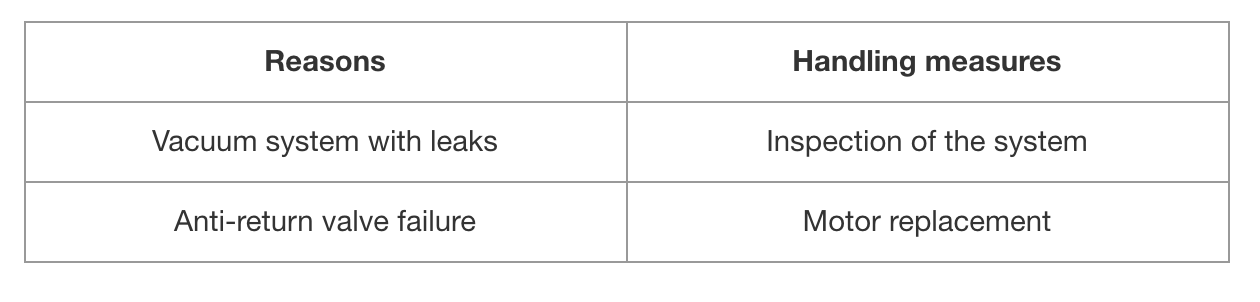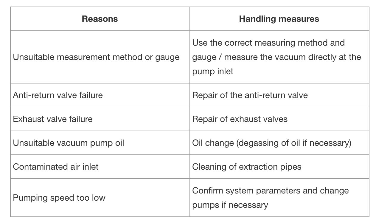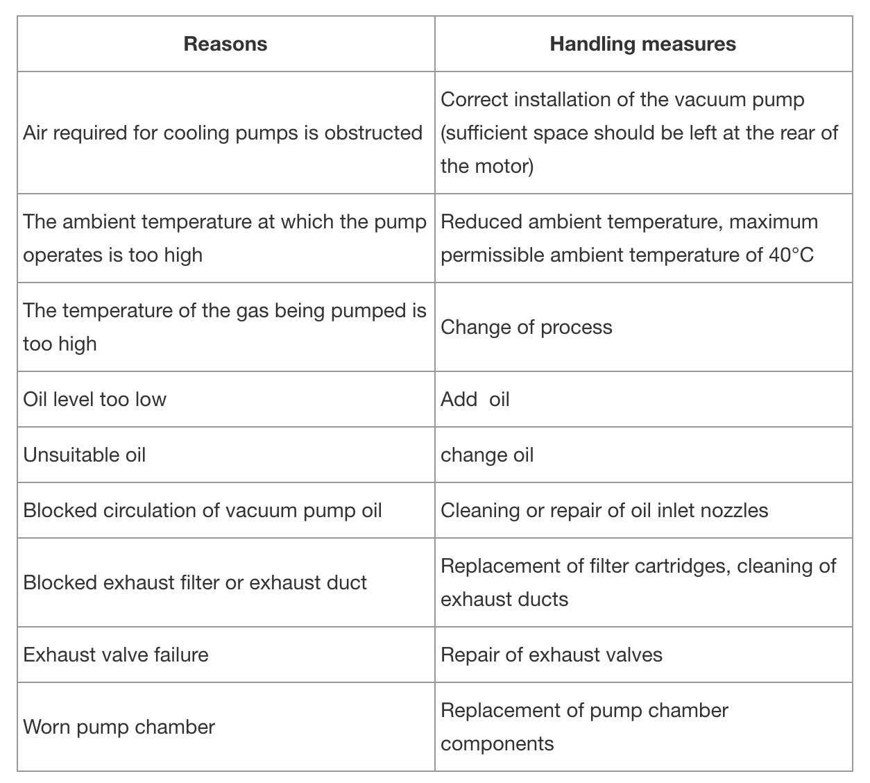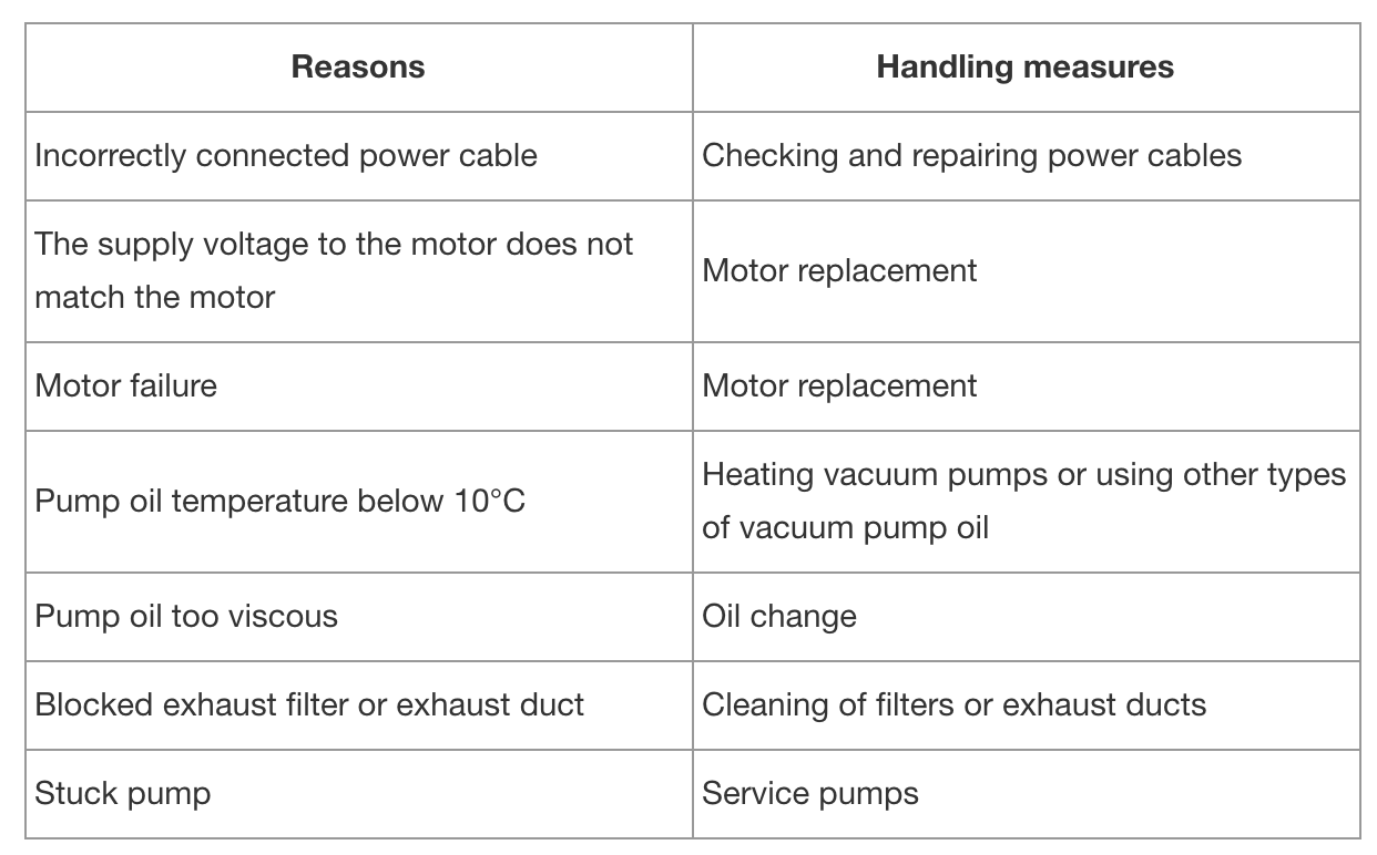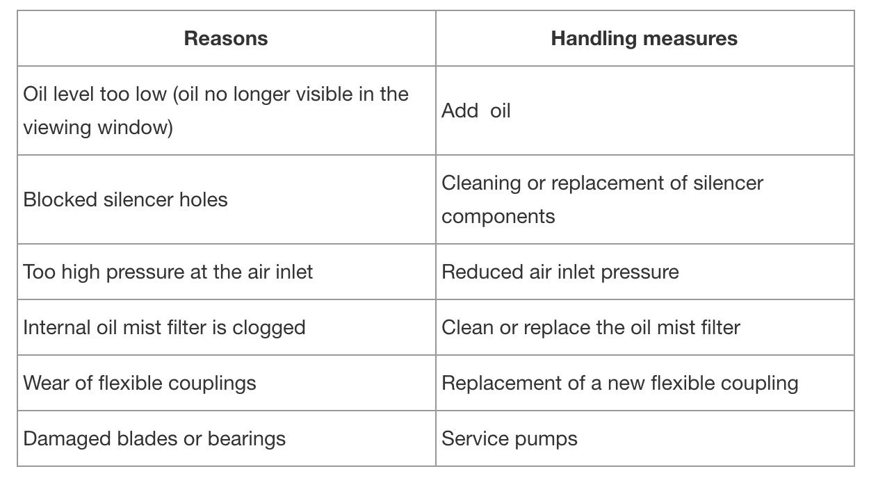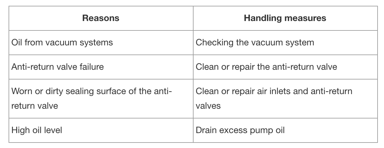 Possible causes and corresponding repair methods: Condensable gas condensation – degassing the oil or changing the oil and flushing the pump chamber can prevent such problems by opening the gas ballast valve in advance.