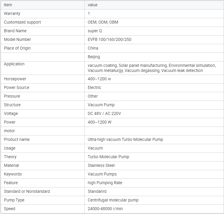 EVFB molecular pump is a high-speed rotating momentum transfer vacuum pump, characterized by fast start-up speed, wide working range, low operating power consumption, high cleanliness ratio, and simple maintenance operation. It is an important vacuum acquisition equipment for achieving high and ultra-high vacuum.